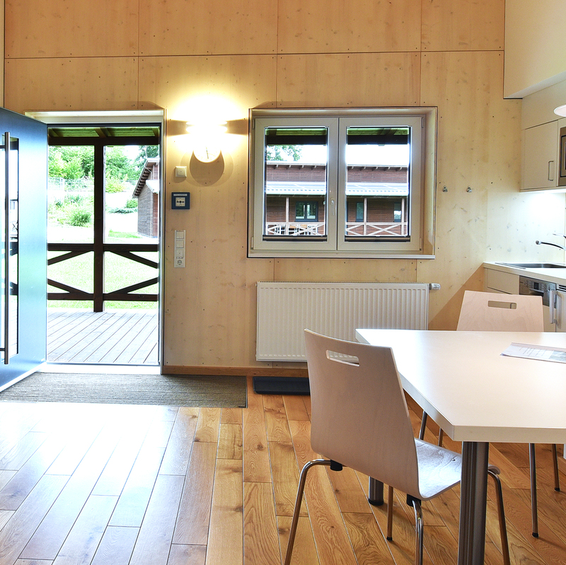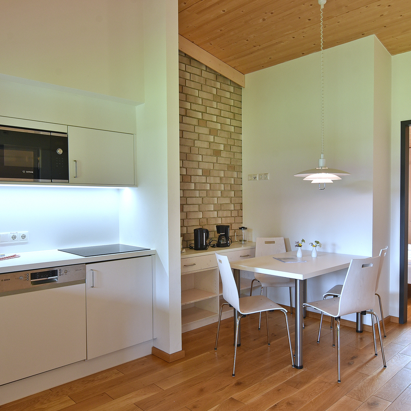 Die im Jahr 2018 neu erbauten Ferienwohnungen liegen idyllisch ca. 200 Meter hinter dem Haupthaus und bieten auf rund 48 m² komfortablen Platz für Familien und Gruppen. Insgesamt stehen Ihnen neun moderne Wohnungen zur Verfügung – davon sind drei barrierefrei gestaltet.